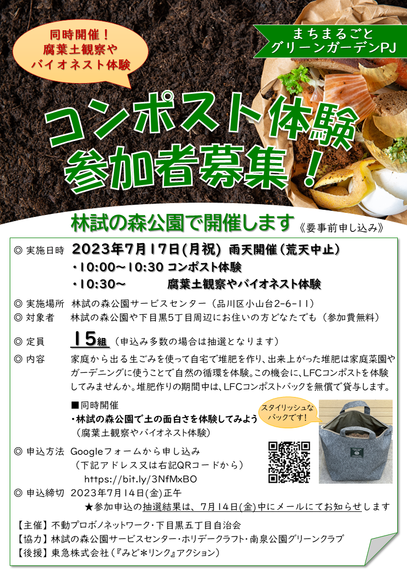 不動プロボノネットワークと下目黒五丁目自治会、南泉公園グリーンクラブ、東急株式会社(みど*リンクアクション)が共同で行う「まちまるごとグリーンガーデンプロジェクト」での、コンポスト体験の参加者を募集します!