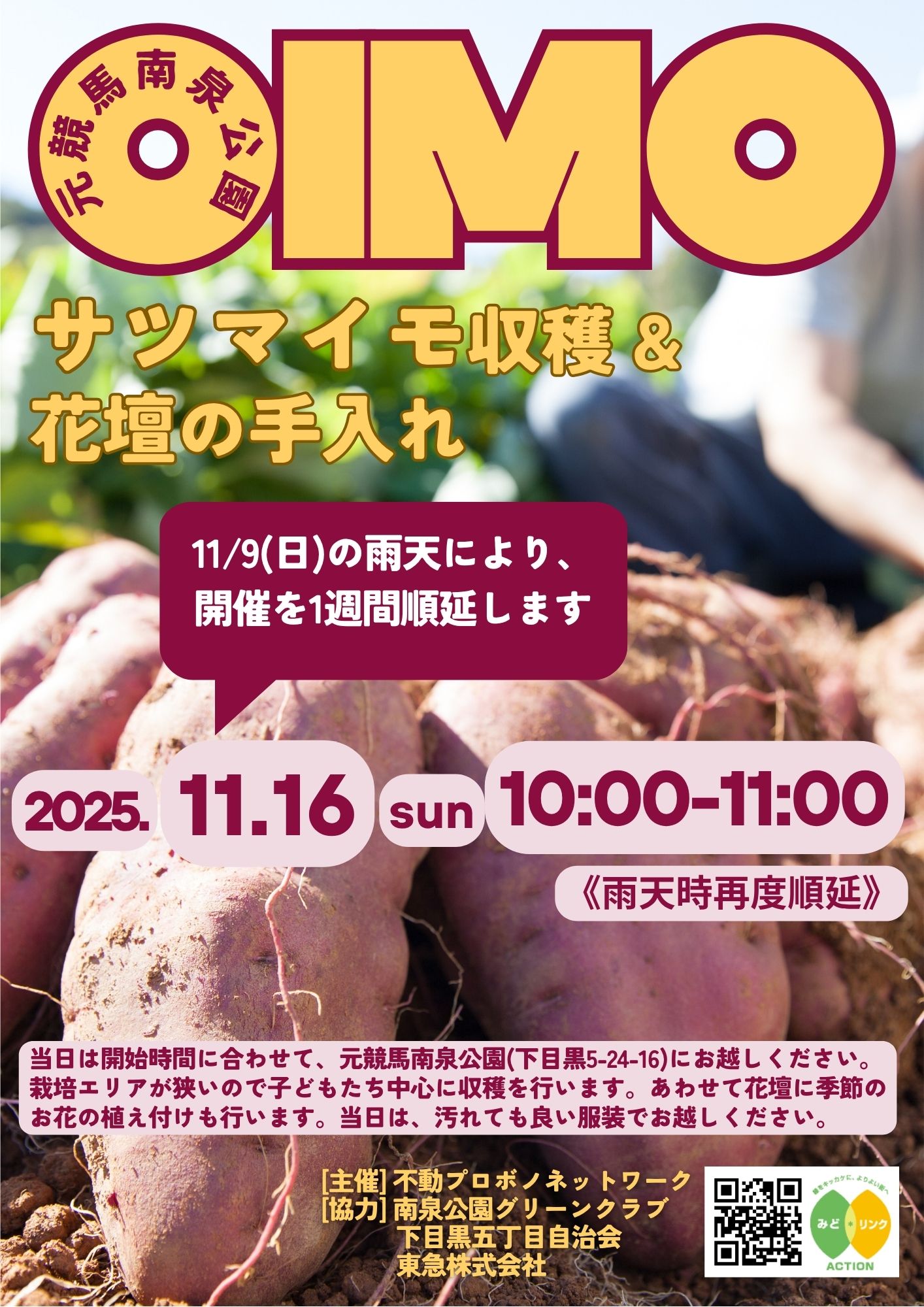 2025年11月16日(日)10時から元競馬南泉公園で、下目黒五丁目自治会と一緒に「まちまるごとグリーンガーデン:サツマイモの収穫体験」を行います。今年4月に植えたサツマイモを一緒に収穫してみませんか?